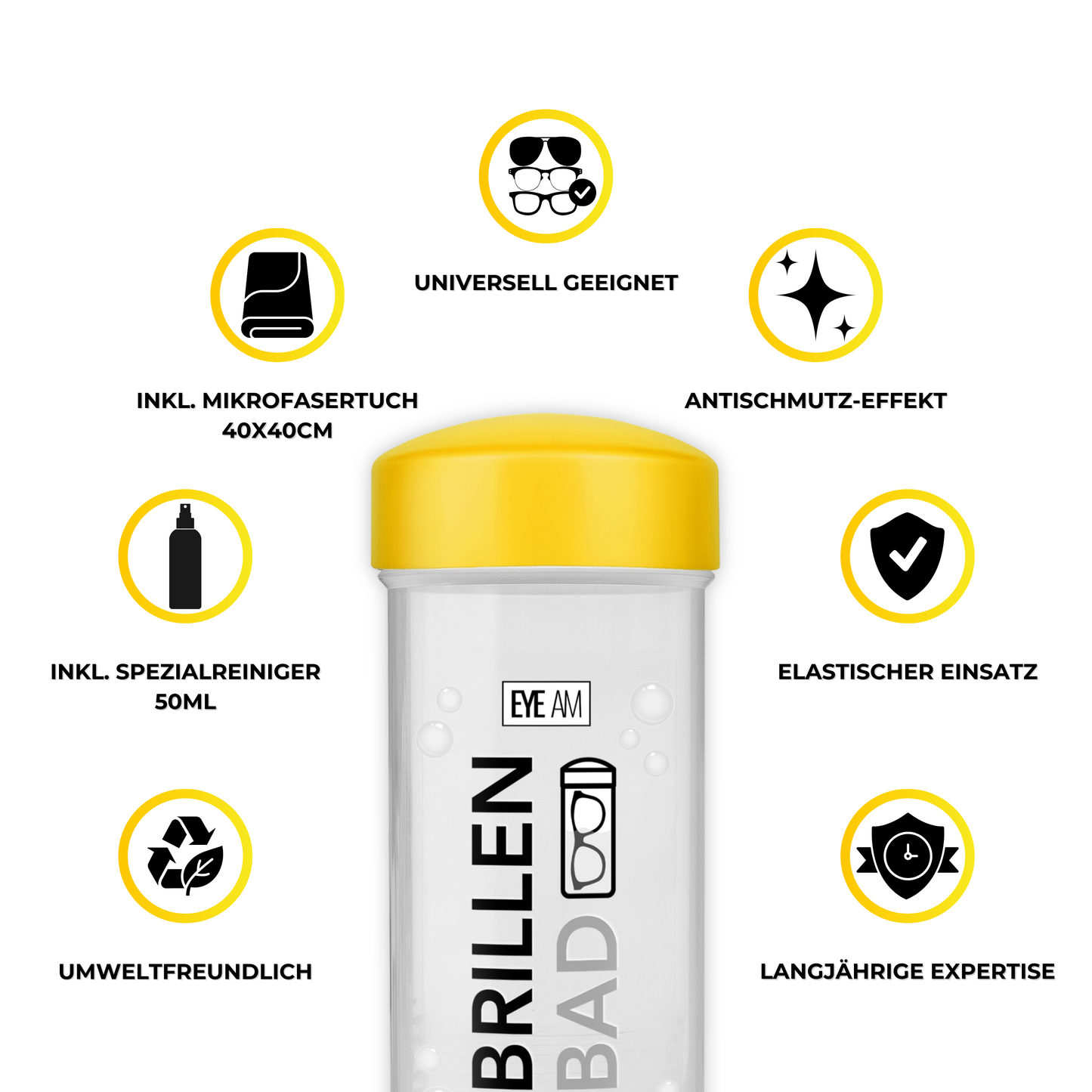 EyeAm Brillenbad im Set mit 50ml Spezialreiniger & Mikrofasertuch (Gelb)